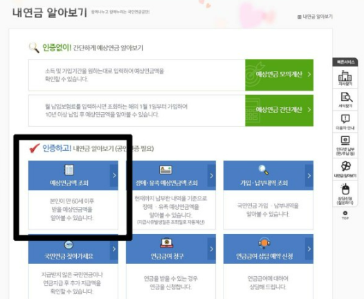 국민연금 사이트에 들어가시면 '내 연금 알아보기'라는 코너가 있는데 이 화면을 통해 예상 연금액을 조회할 수 있습니다. 이를 위해서는 공인인증서, 공동인증서가 반드시 필요하니 꼭 이것이 준비된 상태에서 진행하시길 바랍니다.
