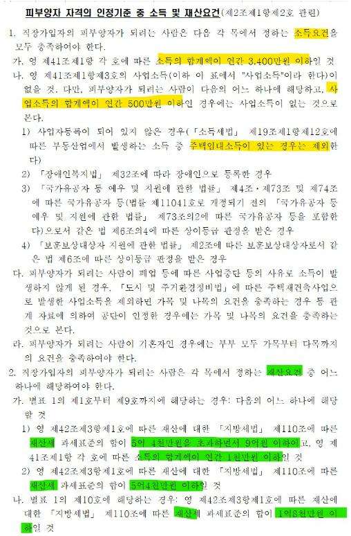 특히나 소득은 연 소득 3,400만 원 이하이거나 사업 소득이 없어야 피부양자 조건을 만족할 수 있습니다. 장애인, 국가유공자, 보훈대상자의 경우에는 사업 소득이 연 500만 원 이하라면 피부양자 대상이 될 수 있습니다.. 다만 이 경우에도 주택 임대 소득이 있는 경우에는 대상에서 제외됩니다. 상세 법령은 아래와 같습니다.