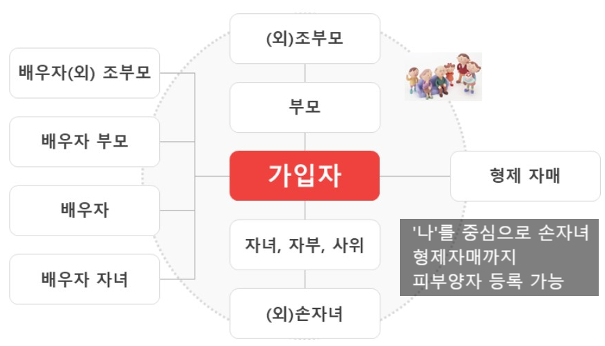 건강보험 피부양자 조건은 가입자를 중심으로 형성됩니다. 부모님, 배우자, 자녀는 기본이며 배우자의 부모, 배우자의 조부모, 손자녀, 형제 자매까지 폭넓게 피부양자 대상이 될 수 있습니다. 상당히 먼 친인척 관계까지 모두 포함이 되기 때문에 그 적용 가능 범위가 상당히 크다고 할 수 있습니다.