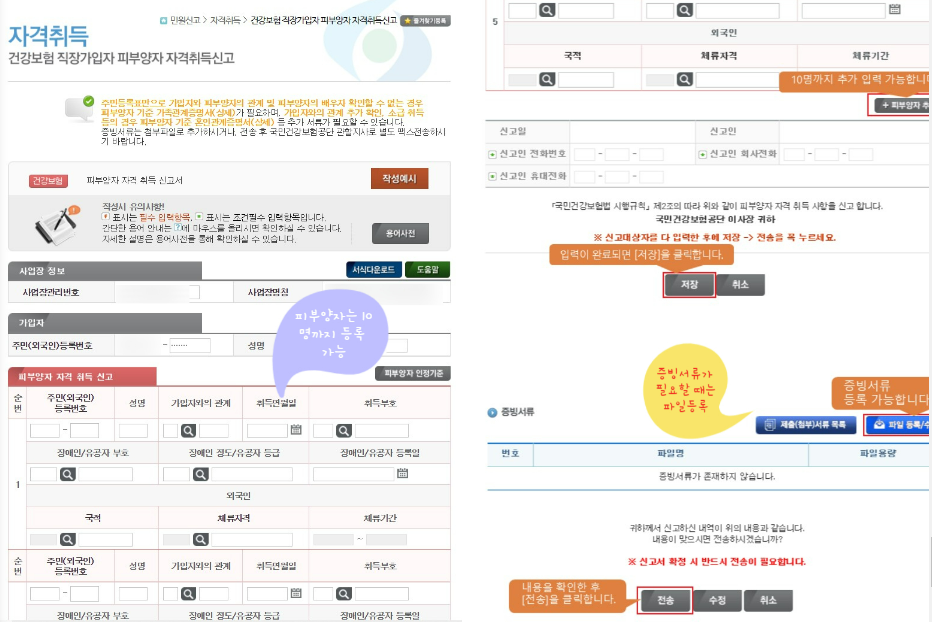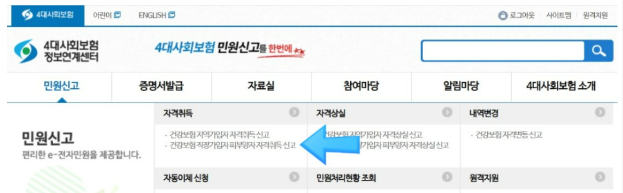 - 3단계: 민원 신고 → 자격 취득 → 건강보험 직장 가입자 피부양자 취득 신고 진행 (제출 서류 사전 준비)