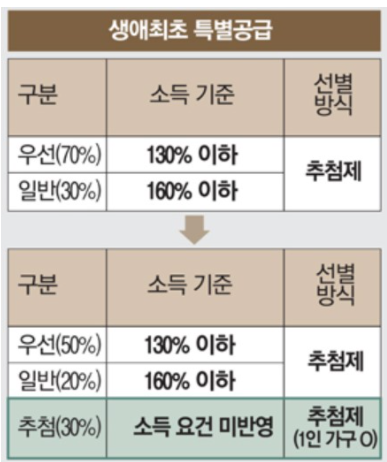 생애 최초 특별 공급 조건의 경우 그 비율은 동일하게 30% 추첨제가 배정되었습니다. 다만 이전에 참여가 제한되었던 1인 가구도 청약 당첨이 가능하게 변경되었으며, 마찬가지로 소득 요건이 제외되었음을 볼 수 있습니다.