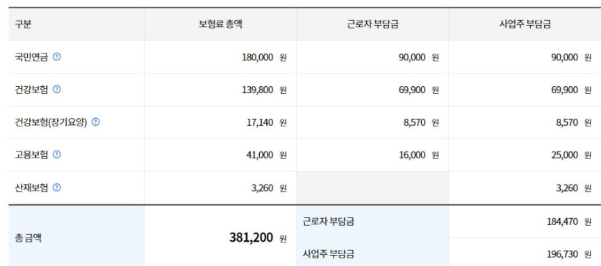 예를 들어 월 200만 원을 수령하는 근로자라면 원천 징수로 어느 정도 비용이 제해지는지 4대 보험 계산기를 통해 확인하실 수 있습니다. 4대 보험에 대한 근로자 부담금 총액은 184,470원, 사업주 부담금 총액은 196,730 원으로 총 381,200원이 해당 근로자의 4대 보험료로 책정되는 것을 보실 수 있습니다.