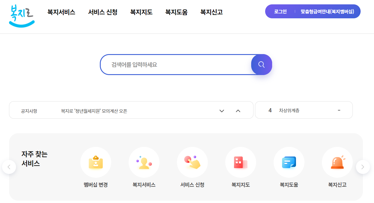 복지로 홈페이지는 아래와 같이 생겼습니다. 이미지를 클릭하시면 바로 복지로 홈페이지로 이동하실 수 있으니 참고하세요.