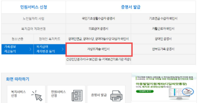 차상위계층 조건이 부합되는 경우 신청과 혜택 확인은 복지로 홈페이지에서 진행하실 수 있습니다. 차상위계층의 경우 제공되는 정부 지원 서비스가 54개 정도 되는데 복지로 홈페이지에서 '한 눈에 보는 복지 정보 → 가구 상황'을 클릭하시면 원하시는 서비스를 한 눈에 보실 수 있습니다.