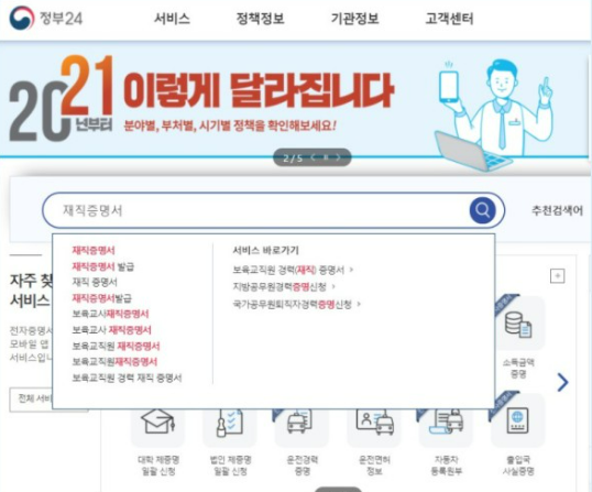 재직증명서, 경력증명서는 정부24에서도 출력이 가능한데 다만 정부24 사이트를 통한 재직증명서 신청은 공무원만 가능합니다. 보육교육직, 지방공부원, 국가공무원 재직 또는 퇴직자의 경우 정부24 사이트에서 증명서 발급이 가능하니 참고하시면 좋을 듯 합니다.