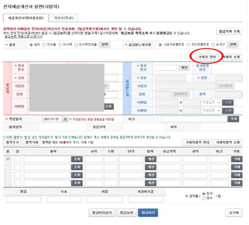 '건별 발급'을 누르면 전자세금계산서 양식이 뜹니다. 여기서 왼쪽 빨간색은 본인의 사업자 정보를 입력하는 곳이고, 우측 파란색은 상대방 사업자 정보를 입력하는 곳입니다. 거래가 자주 발생하는 곳이라면 '거래처 관리'를 눌러서 거래처 등록을 해두시는 것이 편리합니다.