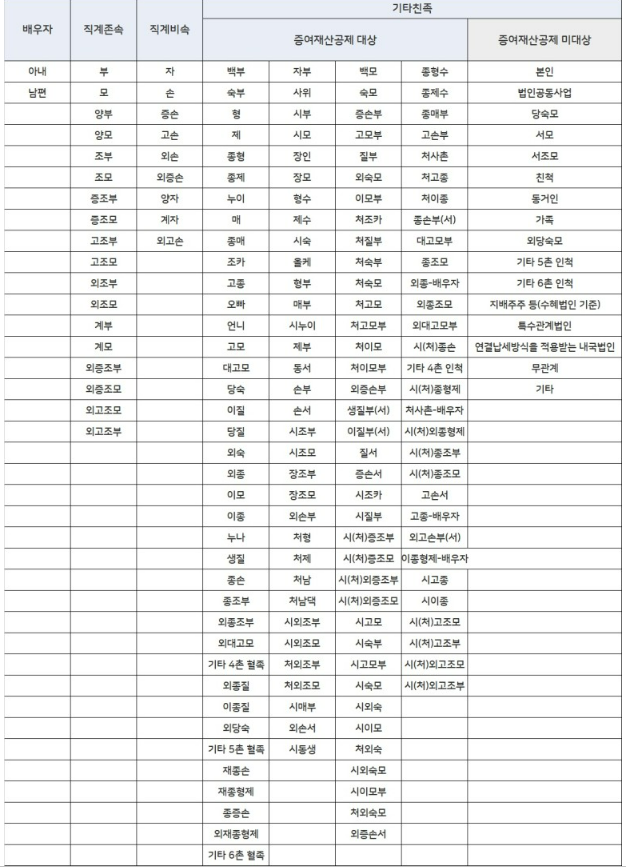 여기서 직계존속, 직계비속의 범위는 정확히 어떻게 되는지 궁금하신 분들이 많으실 겁니다. 기타 친족은 6촌 이내의 혈족, 4촌 이내의 인척의 경우에도 정확한 촌수와 혈족, 인척 관계를 따질 필요가 있습니다. 이에 대해서는 아래 표를 참고해주시면 되겠습니다.