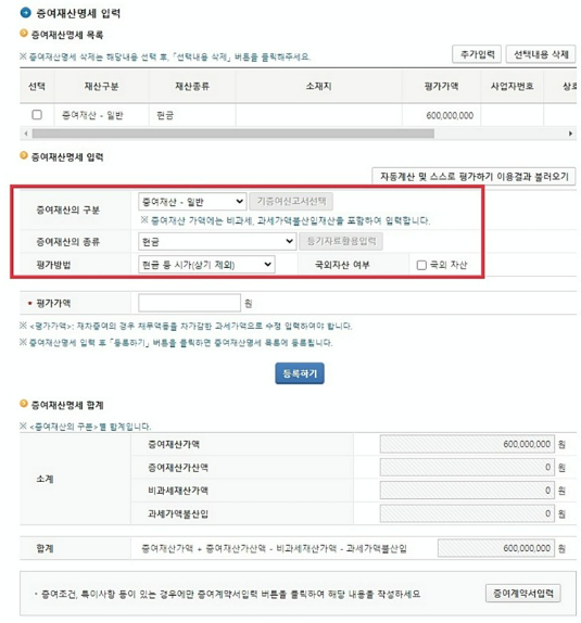 증여 재산 정보를 입력하는 화면에서는 증여하시는 재산의 특성에 맞춰 재산 구분, 재산 종류, 평가 방법 등을 그에 맞게 입력하면 됩니다. 현금 증여의 경우 재산 구분은 일반, 재산 종류는 현금, 평가 방법은 현금 등 시가를 선택하시면 됩니다.