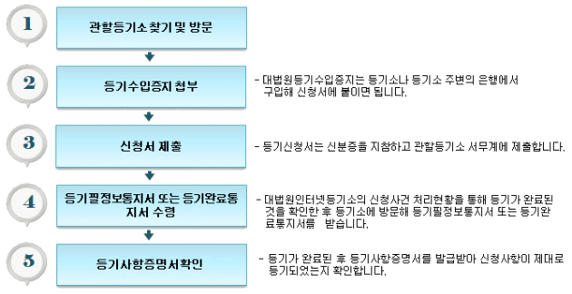근저당 설정 신청은 크게 '관할 등기소 찾기 방문 → 등기수입증지 첨부 → 신청서 제출 → 등기필통지서 또는 등기완료통지서 수령 → 등기사항증명서 확인' 이렇게 5단계로 이루어집니다.