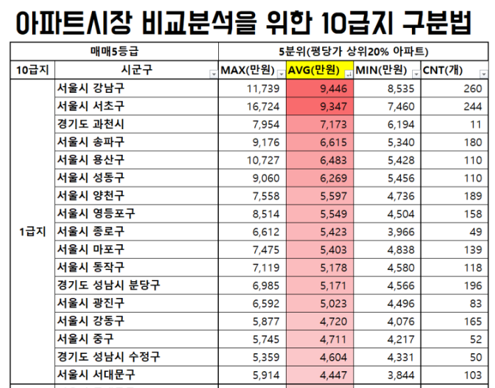 이렇게 176개 시, 군, 구 내에서 각각 5분위 (고가 단지 상위 20%) 단지들의 평균 가격을 기준으로 10분위를 구분하고 이를 10급지로 산정하게 됩니다.