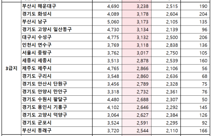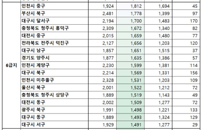 급지의 높고 낮음 그 자체가 중요하기보다는 동일한 급지에 어떠한 지역들이 함께 묶여 있는지를 봐야 합니다. 예를 들어 경남 진주, 제주도 서귀포, 경기도 이천, 울산 동구, 대전 대덕구, 울산 울주군, 대구 달성군, 충남 아산, 충북 청주 청원, 전남 여수, 경남 양산, 전남 순천, 전남 무안, 경북 경산, 부산 사하구, 강원 속초, 경북 포항 남구, 강원 춘천은 서로 동일 급지로 분류되어 있습니다.