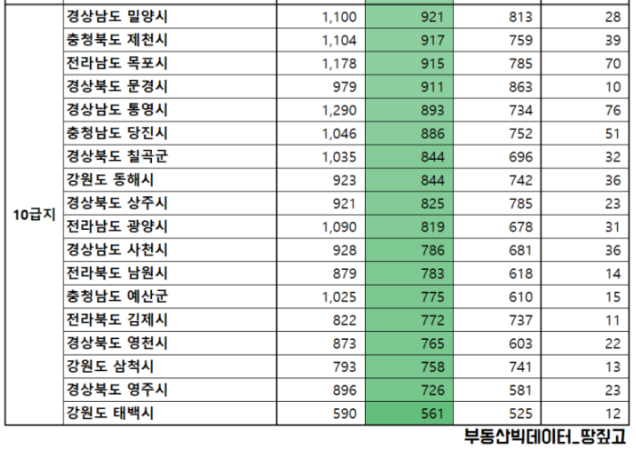 9급지에도 나름 익숙한 지역들이 많이 있습니다. 경기 동두천, 경기 포천이 9급지로 분류되어 있는 것이 눈에 띕니다. 같은 급지에 충남 보령, 충남 논산, 경북 안동, 부산 중구 등이 있습니다.