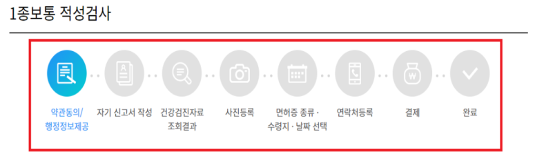 온라인 적성 검사 또는 갱신의 경우 '약관 동의 → 자기 신고서 작성 → 건강 검진 자료 조회 결과 → 사진 등록 → 면허증 종류, 수령지, 날짜 선택 → 연락처 등록 → 결제' 순으로 진행됩니다.
