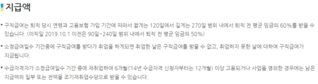 구직 급여는 퇴직 당시 연령과 고용 보험 가입 기간에 따라서 짧게는 120일에서 길게는 270일 범위 내에서 퇴직 전 평균 임금의 60%를 받을 수 있습니다.