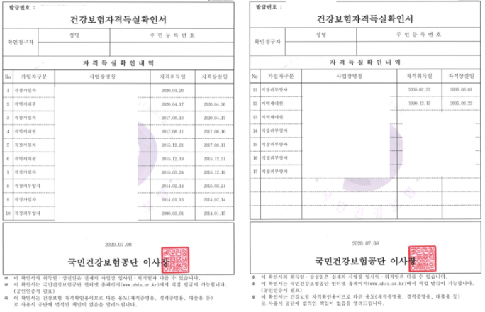 건강보험자격득실확인서, 줄여서 자격확인서란 말 그대로 건강보험 자격을 득하고 실한 내역이 있는지를 증빙해주는 확인서입니다. 본인이 태어나서 현재까지 언제 어떤 방식으로 건강보험에 가입이 되어 있었는지를 알 수 있습니다. 직장 가입자, 피부양자의 경우 어떤 사업장을 통해 직장 가입자, 피부양자로 가입이 되어 있던 것인지도 확인이 가능합니다.