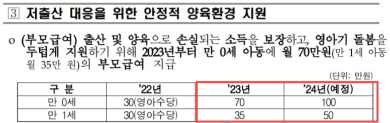 2023년부터 아동 수당, 영아 수당이 부모 급여로 대체되면서 만 0세는 월 70만 원, 만 1세는 월 35만 원으로 그 지원 규모가 확대된 것입니다. 위에서 말씀드린 것처럼 이는 2024년 이후 만 0세는 월 100만 원, 만 1세는 월 50만 원으로 확대됩니다.