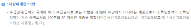 차상위계층에 대한 기준, 정의는 다음과 같습니다. 차상위계층 기준은 기본적으로 기초생활보장법 수급 대상은 아니지만 바로 그 위의 계층으로, 잠재적 빈곤계층이라 할 수 있습니다. 중위 소득 기준 50% 이하의 계층으로 소득이 최저 생계비 이하이지만 자신을 부양할만한 가족이 있거나, 재산이 있어 기초생활수급자 대상에서 제외된 층이 차상위계층에 속합니다.