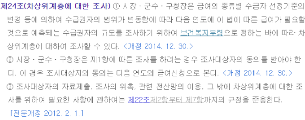 차상위계층은 시장, 군수, 구청장이 수급권자의 범위 또는 기준이 변동함에 따라 미리 수급권자의 규모를 조사하기 위한 조사를 시행합니다. 조사에 동의를 할 시 다음연도 급여를 신청하는 것으로 간주합니다.