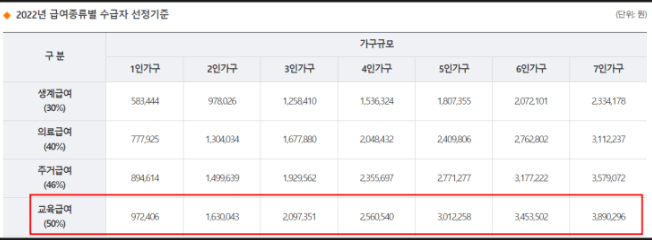 | 주거, 교육, 차상위, 한부모 | 30만 원 | 49만 원 | 62만 원 | 75만 원 | 87만 원 | 98만 원 | 109만 원 |