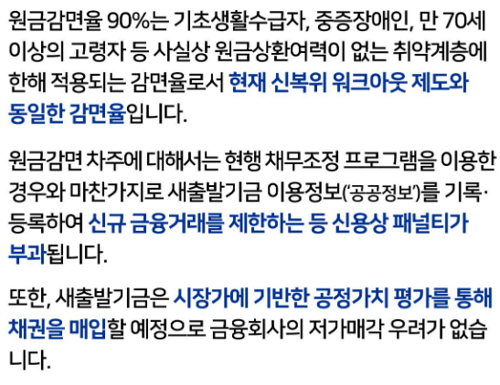 | 원금 | 담보 대출: 조정 없음 신용 대출: 상환 여력 따라 0-80% 감면, 취약 계층은 90% 감면 |