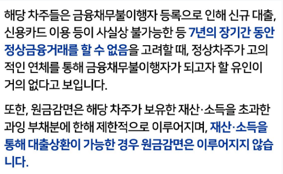 | 신용 정보 확인 | - 원금 감면 차주는 공공 정보 기록 - 변제 후 2년 간 신규 금융 거래 제한 - 변제 시작 후 2년 경과 시 해제 |