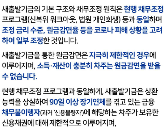 빚투 논란이 있었던 만큼 도덕적 해이를 막기 위해 고의 연체는 해당 사업에 신청이 불가하며, 보유 재산을 초과하는 부채에 한해서만 채무가 조정되며 원금 감면 차주는 공공 정보를 등록·공유함으로써 금융 거래에 제한을 받게 됩니다.