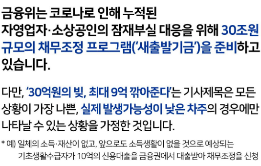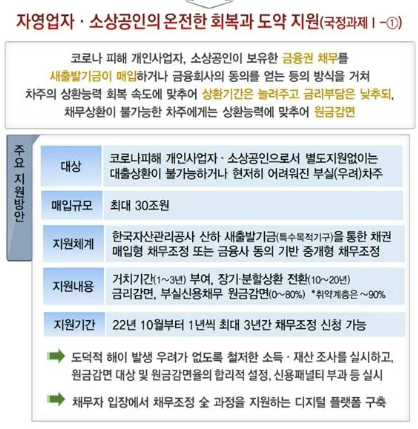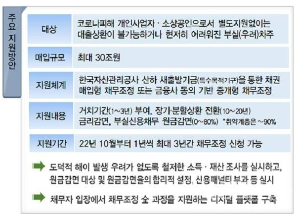 | 지원 대상 | (1) 코로나 피해 입증이 가능해야 함 (2) 부실 채무자 또는 부실 우려 채무자 (3) 개인사업자, 법인 소상공인 |
