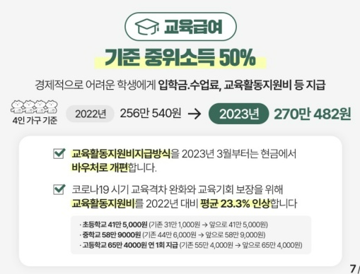 [교육 급여 수급자 혜택: 부교재비, 학용품비, 입학금, 수업료, 교과서비 등]