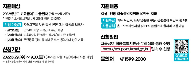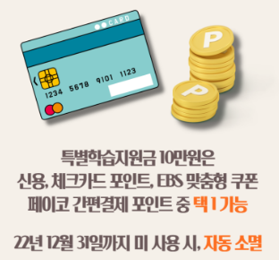 | 신청 방법 | 신청자 본인 확인 및 지급 수단 선택을 통한 신청 (카드 포인트, EBS 맞춤형 쿠폰, 간편 결제 포인트 중 1가지 지급 수단 선택 필수) *지원금 신청 완료 후 지급 수단 변경 불가 *신청 전 지급 기관 회원 가입 필요 (카드사, EBS, 간편결제사 등 → 미가입 시 지원금 지급 불가) |