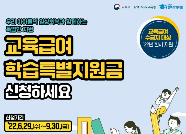 교육 급여 학습 특별 지원금은 1인당 10만 원까지 지원되며 신청 기간은 6월 29일부터 9월 30일까지입니다. 교육부와 17개 시도 교육청, 한국장학재단이 교육 급여 수급자를 대상으로 교재를 구매하거나 EBS 컨텐츠를 이용할 수 있는 학습 보조금을 도내 교육 급여 대상자 2만 5,860명에게 제공할 예정입니다.