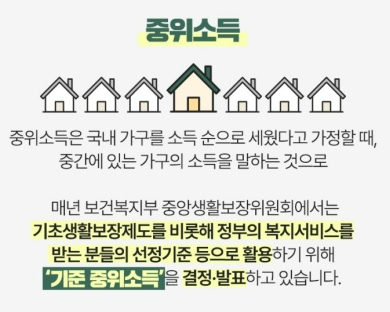 | 기준 중위 소득 | 1인 가구 | 2인 가구 | 3인 가구 | 4인 가구 | 5인 가구 | 6인 가구 | 7인 가구 | 8인 가구 |
