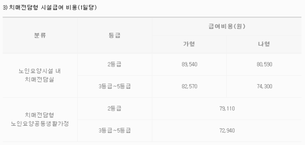| 치매전담형 시설급여 비용 (1일당) | 노인요양시설 내 치매전담실 | 2등급 | 89,540원 (가형) 80,590원 (나형) |